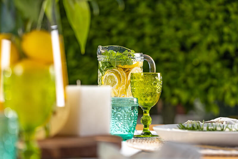 When searching for unique coloured glassware, take note of the pattern. Some will be plain while others will feature minor details or highly patterned glassware. These glasses will stand out from the crowd and draw the eye of your dinner guests. Pair them with less busy details so that the eye isn’t drawn to too many items at once. This approach will result in a balanced table design.