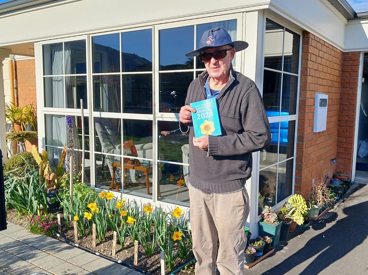 Arch poses with the 2024 New Zealand Daffodil Annual that featured his prize winning bloom.
