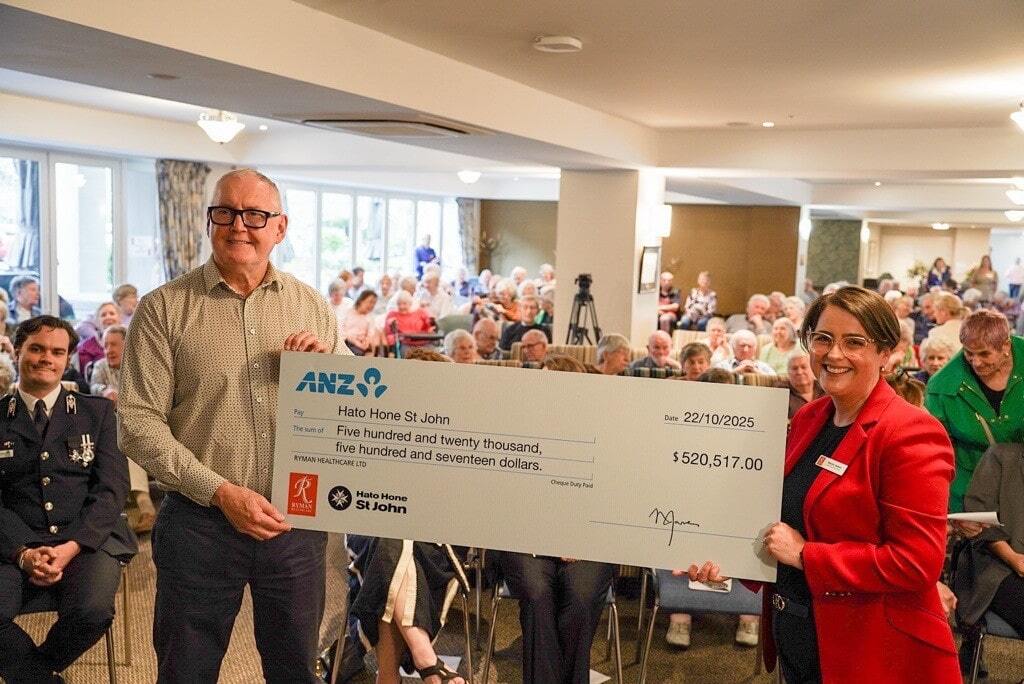 The giant cheque was presented by Ryman Chief Executive Naomi James to Hato Hone St John Chief Executive Peter Bradley at a special afternoon event held at Bert Sutcliffe Village in Birkenhead.