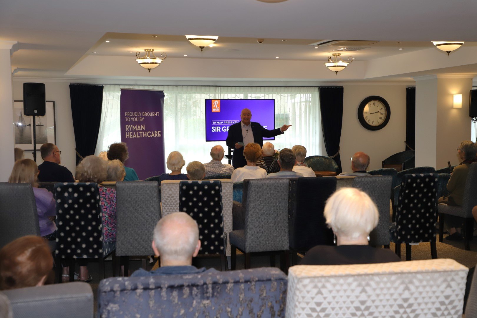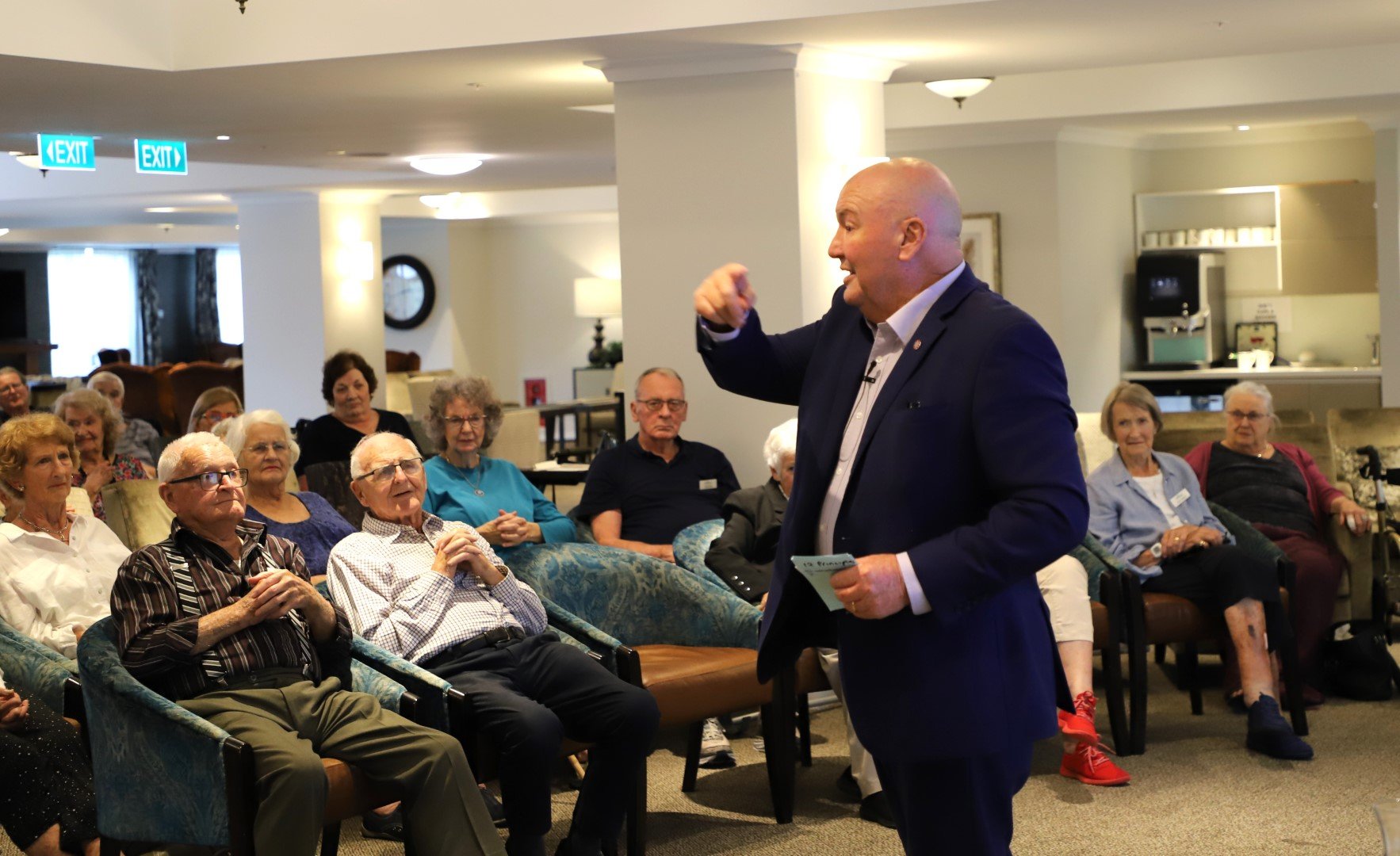Sir Graham had residents laughing during his presentation at William Sanders Village but it was the rewarding work he is doing in prisons that prompted the most emotional reaction, from both him and his audience.