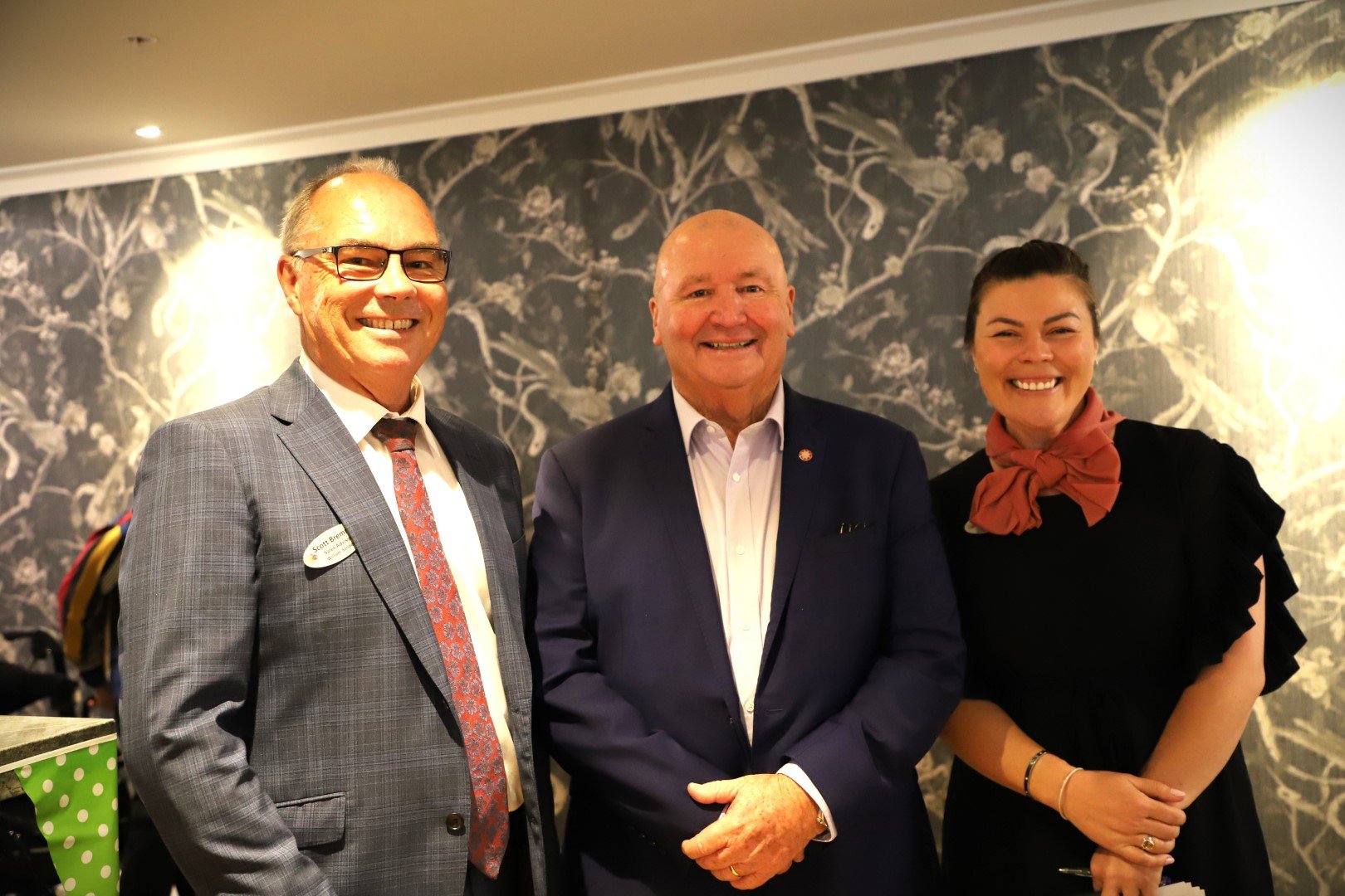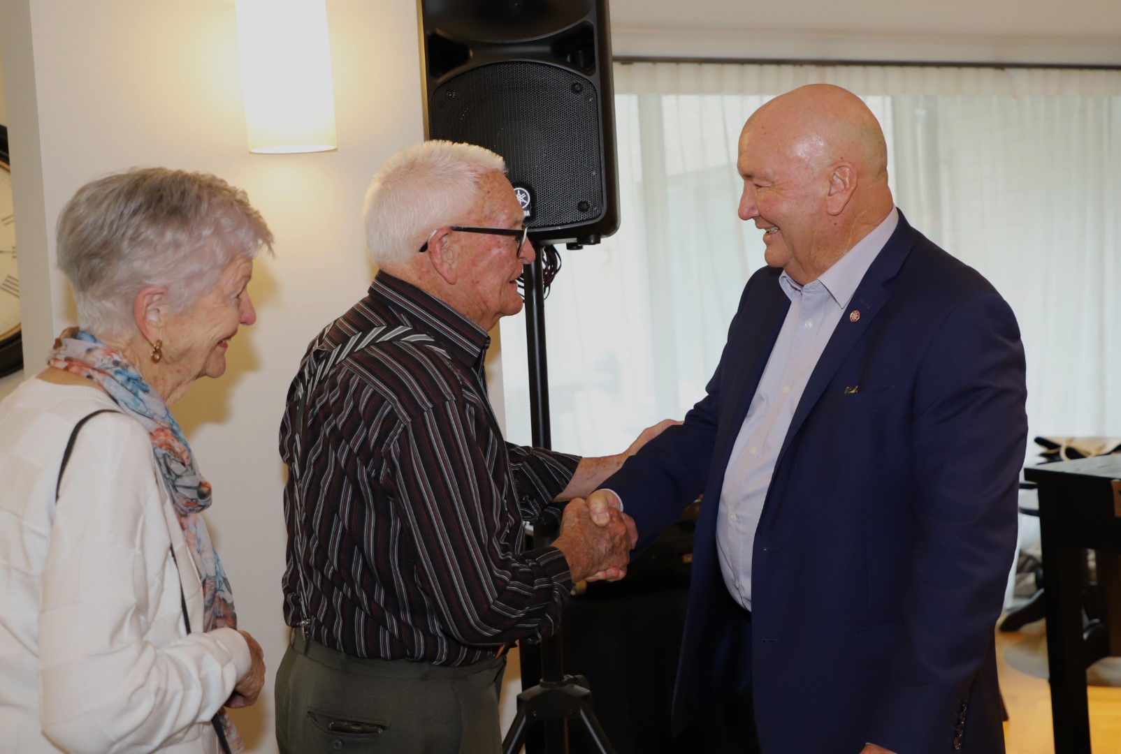 William Sanders residents Vic Murray and Pat McKay line up to thank Sir Graham for his heartfelt and inspiring words (above) and Sales Advisors Scott Bremner and Dell Smythe pose for a photo with their new hero.