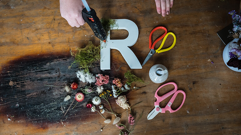 Sarah used statice flowers for this craft. Small and dainty, they’re the perfect way to finish this letter craft. Because you’re hot glueing small details, you might choose to use a pair of tweezers for these tiny details.