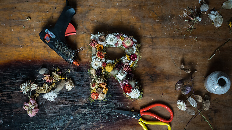It’s time to fill in the gaps. Sarah uses tiny flower heads, glueing them into any small gaps between her dried flowers. This will give your letter a full, complete look.