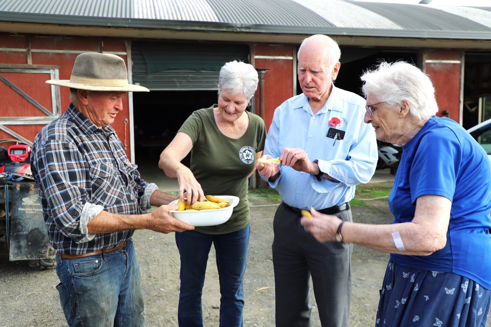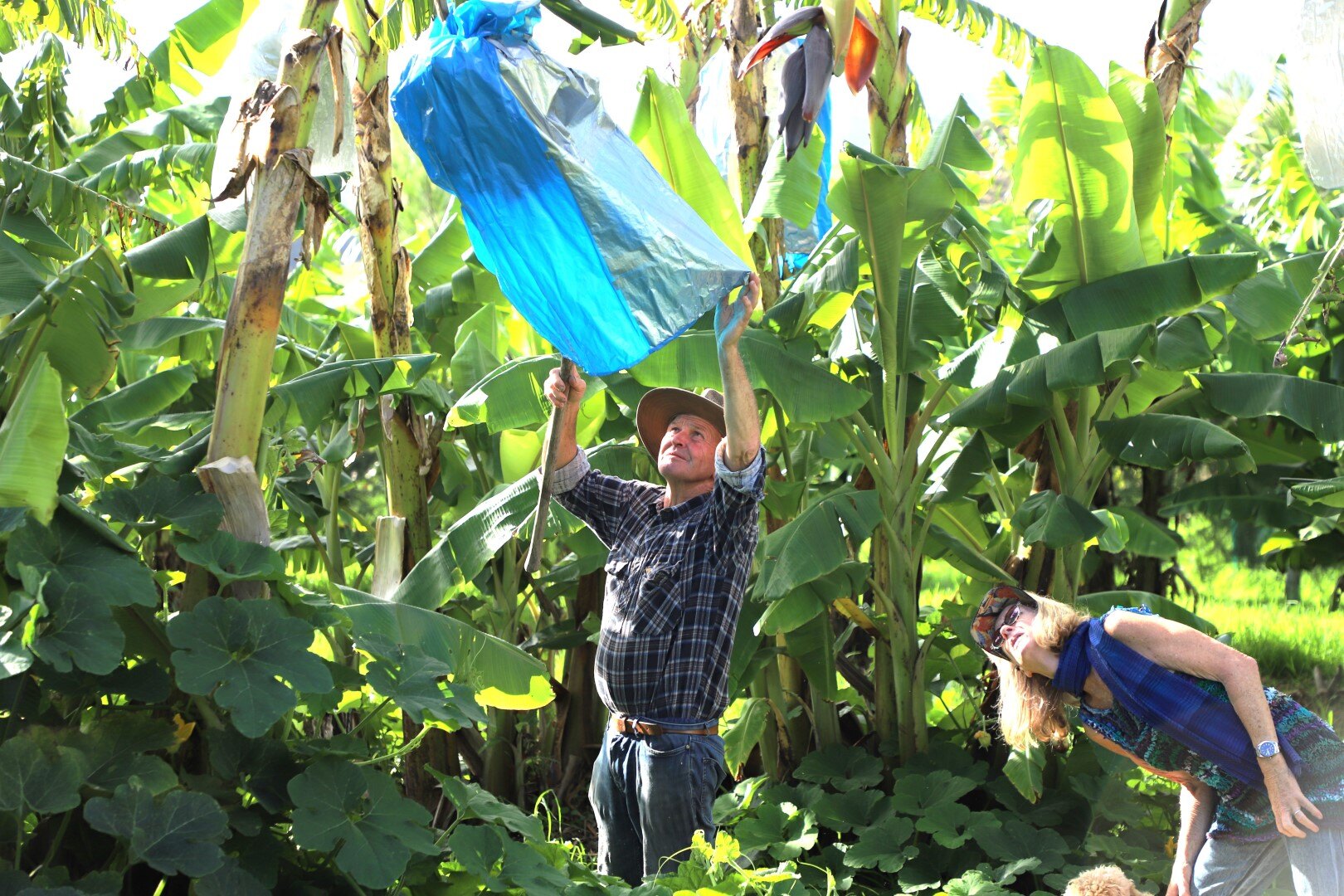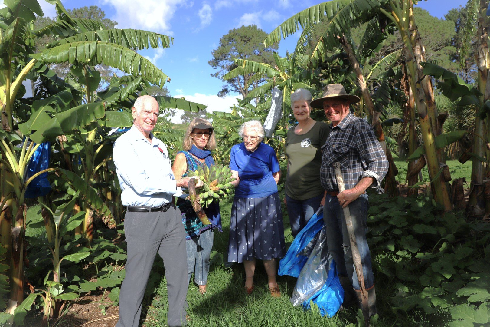 Farmer Phil shares fresh bananas with Betsy, Graeme and Sylvia at his Waitoki farm.