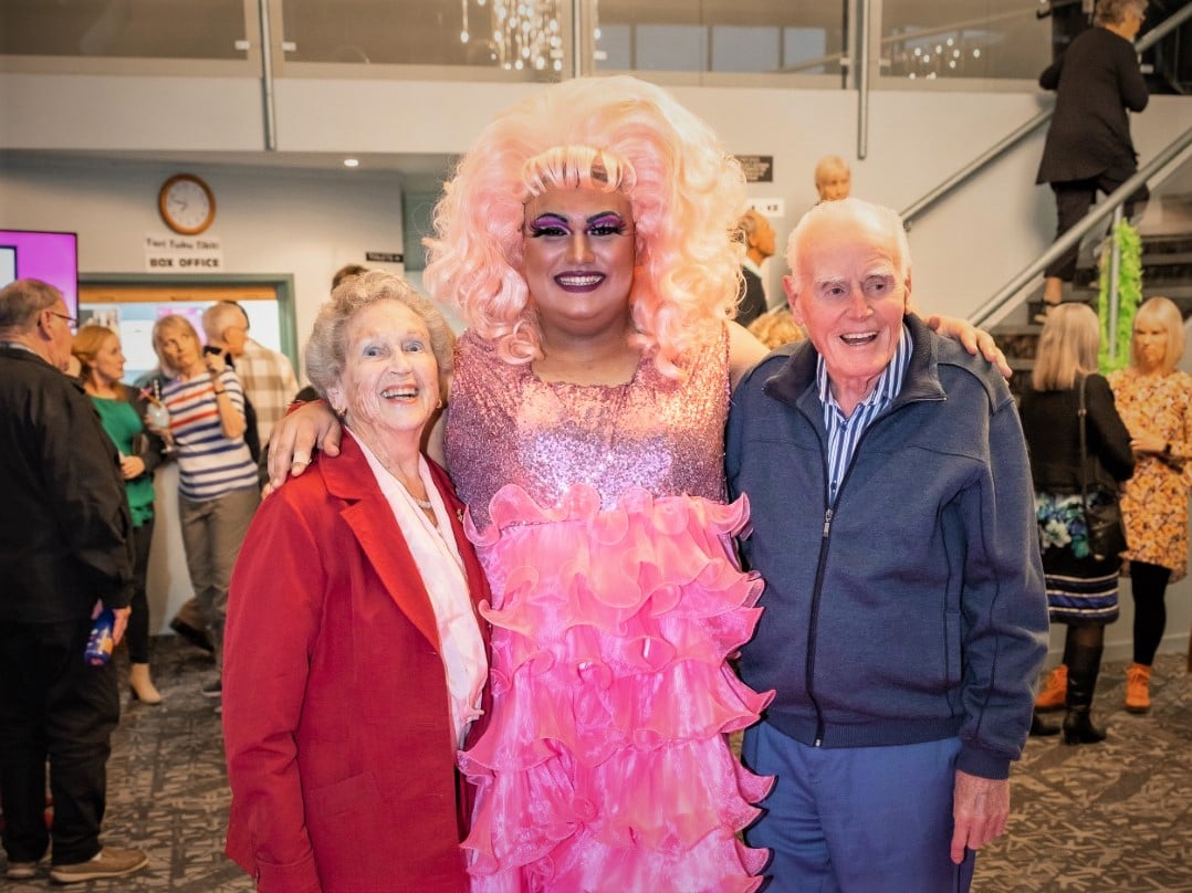 Some of the costumes on show in the colourful spectacle (above) and (below) at Centrestage Theatre in Orewa, and residents Pam Laird and John Rae meet Lady Armilade aka Amrit Soma on the pink carpet (featured top).