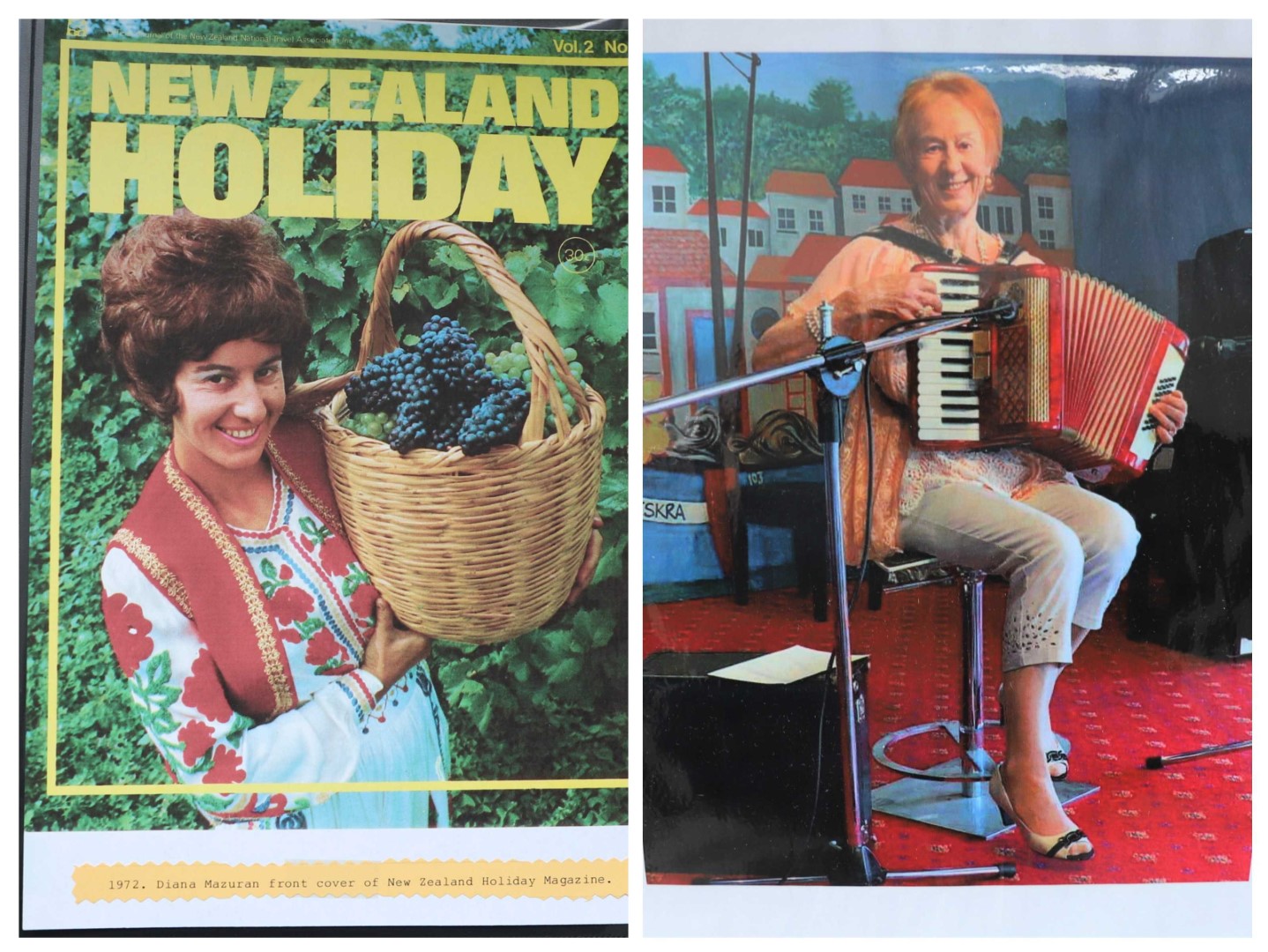Diana in her younger days with some of the grapes that shaped her life, and right, preserving Croatian traditions with a piano accordion performance.