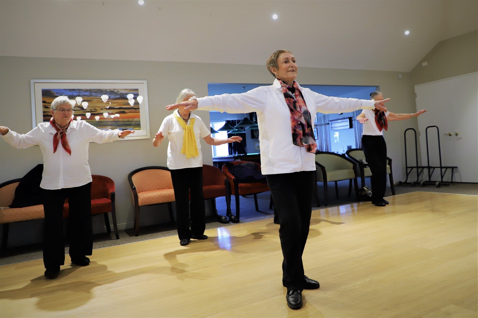 Lorene (centre) and the line dancers at Hilda Ross, including the solo male, Ron Horne. The ladies, from left, are Elizabeth Carlisle, Fiona Green, Mary Collins, Stephanie Mackie, Jill Louw and Janice Smith.