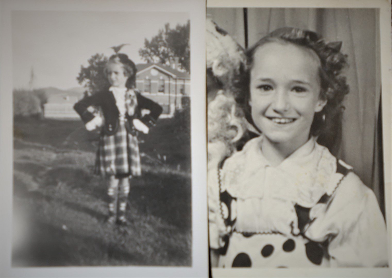 Young Lorene in her Highland dancing gear (left) and (right) in her Christmas outfit as a child growing up in Milton, South Otago. And as a percussionist for Hamilton City Brass with her son Mason as musical director (below).
