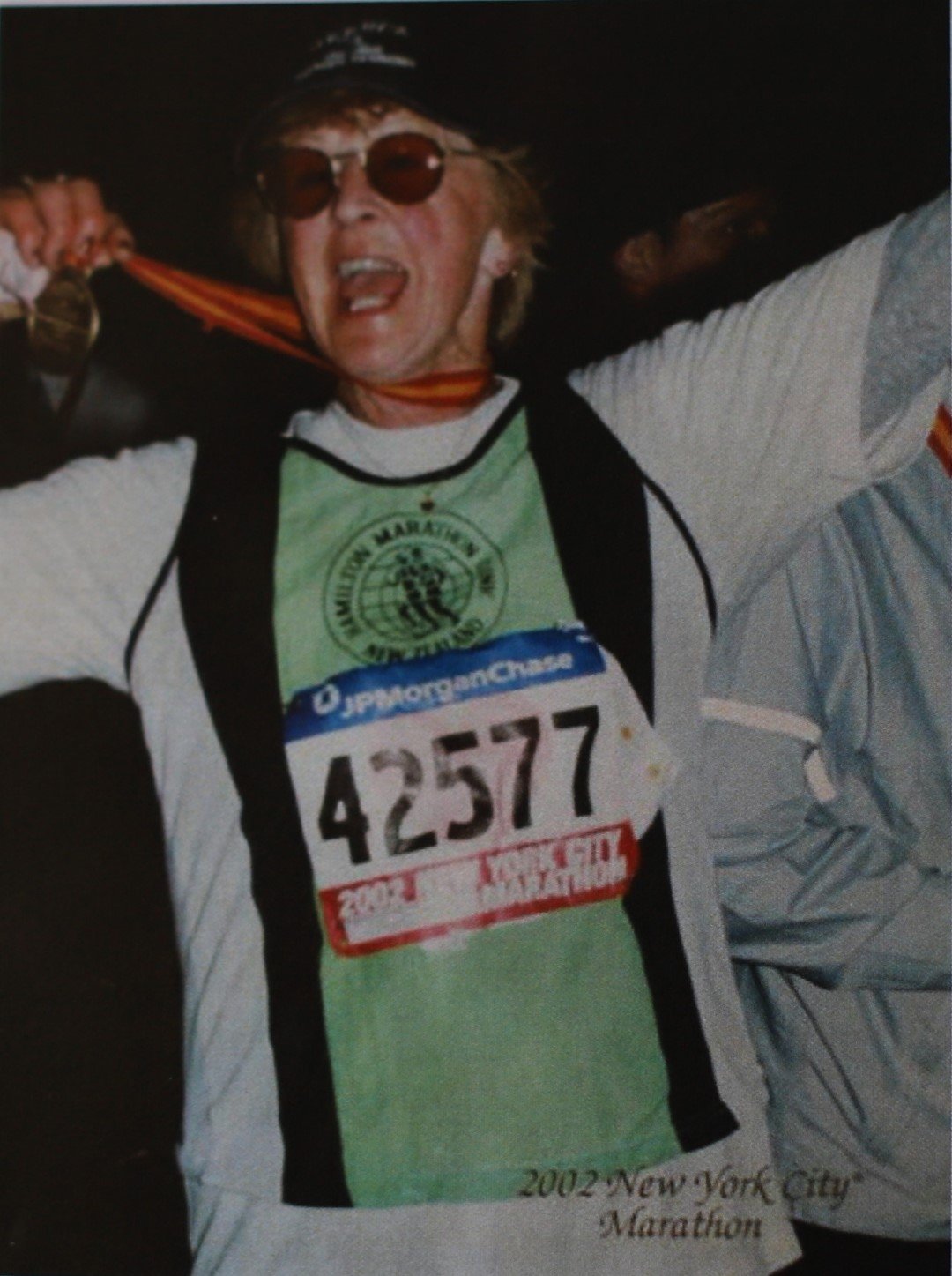 (Above) Rally driver Rita outside her Hamilton hair salon and (below) completing the New York marathon in 2002.