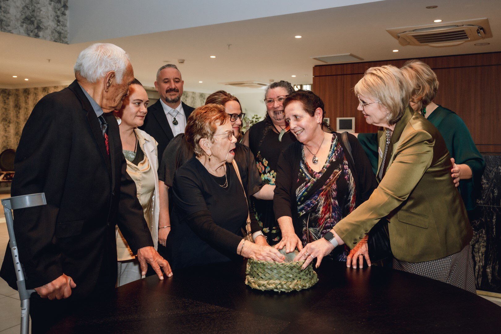 Miriam Corban's daughter Sharon Alexander joins Cheyne Chalmers and Eileen Taua of west Auckland iwi Te Kawerau ā Maki in touching the pounamu mauri stone (above) and (below) Ryman's Executive Chair Dean Hamilton, right, with Corban family members, from left Miriam Corban's daughter Sharon, Miriam's niece and nephew Sandra Khouri and Ray Khouri with his wife Debbie and Miriam's son Alec.