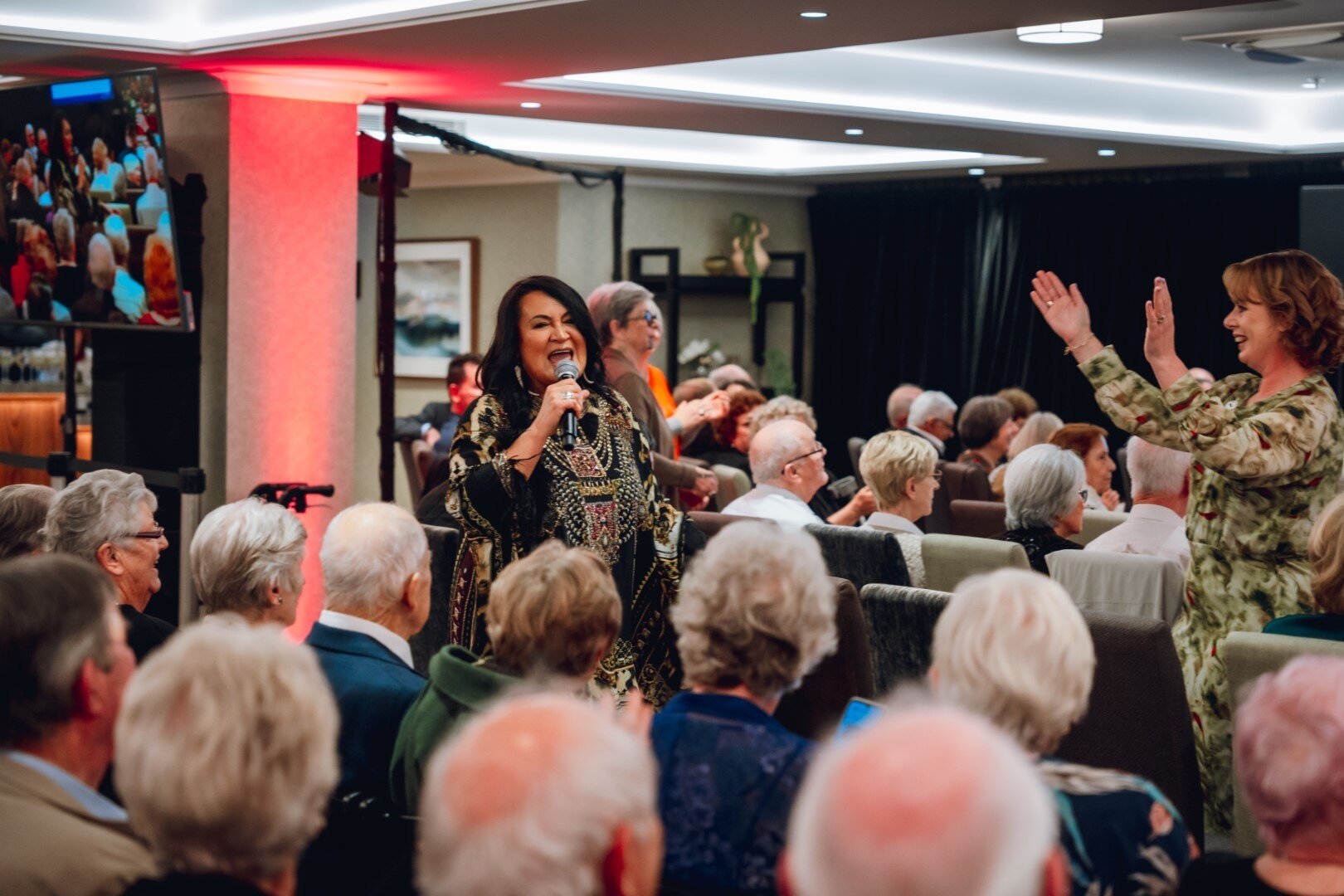 Residents, Ryman team members and special guests loved the entertainment which included a video of the village dance group performing two numbers, and also Kiwi singing star Annie Crummer.