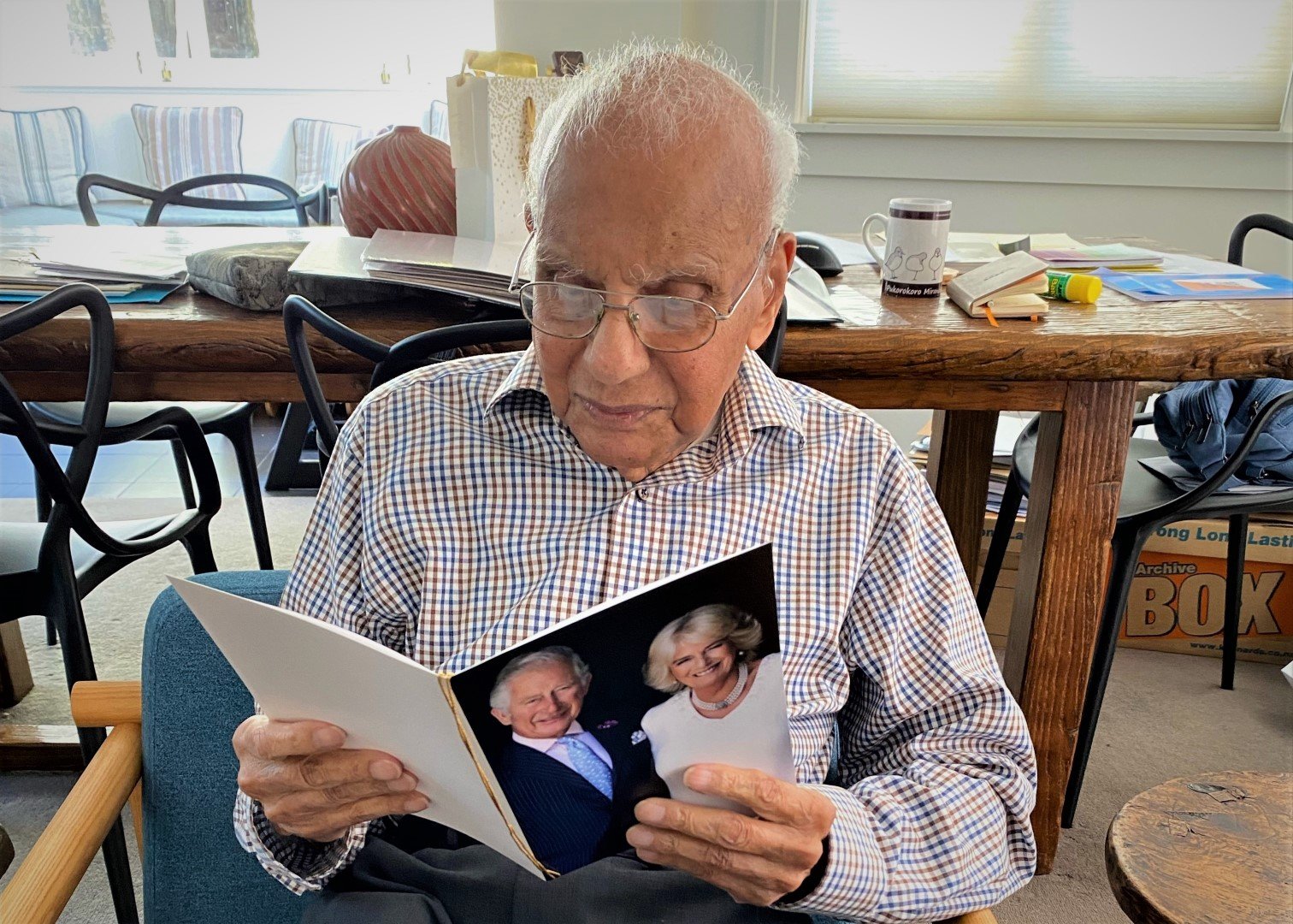 Muru proudly shows off the signed cricket bat (above) and reading his birthday card from King Charles (below).