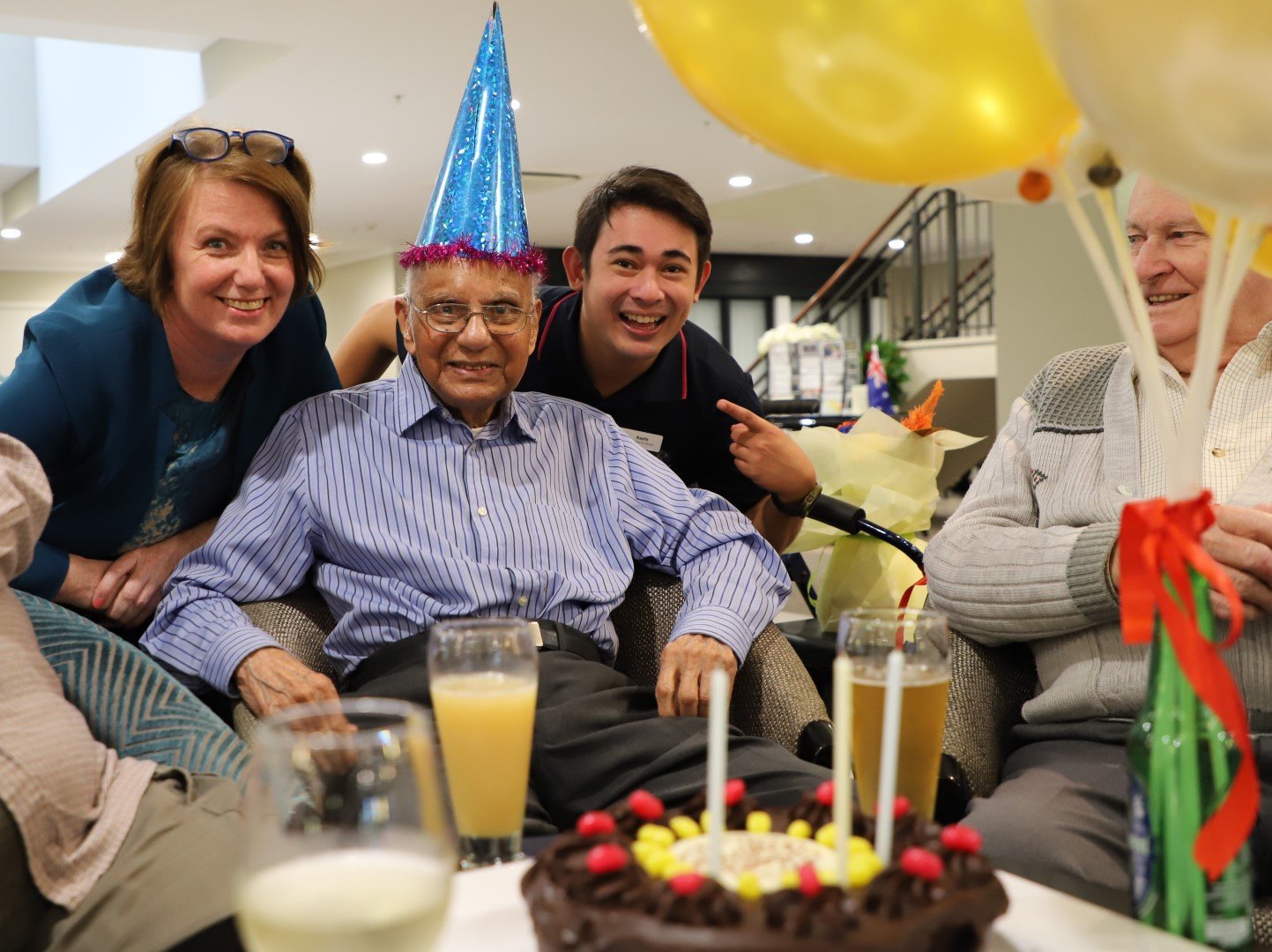 With some of the friends he's made at Logan Campbell (above) and (top pic) with Village Manager Rebecca McMillan and Activity and Lifestyle Coordinator Keefe Martinez who made a fuss of Muru on his special day.