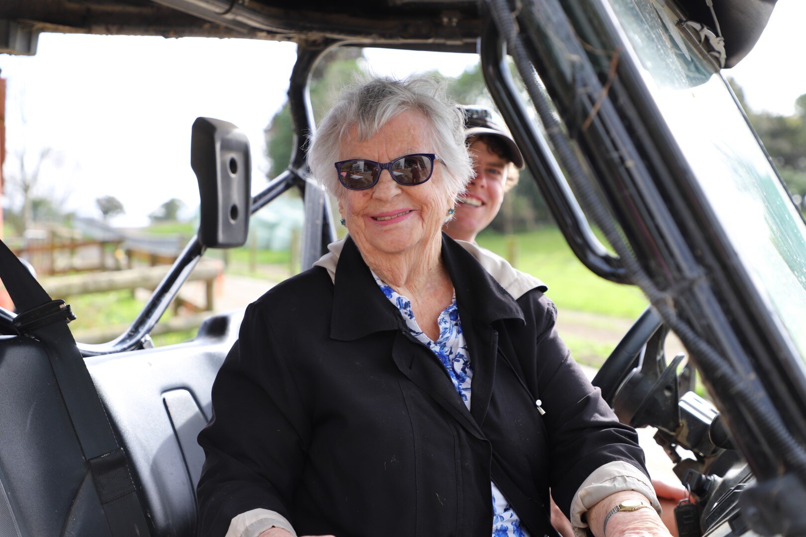 Barbara Malcolm enjoys a ride in the farm vehicle with Farm Manager Sam Waugh.
