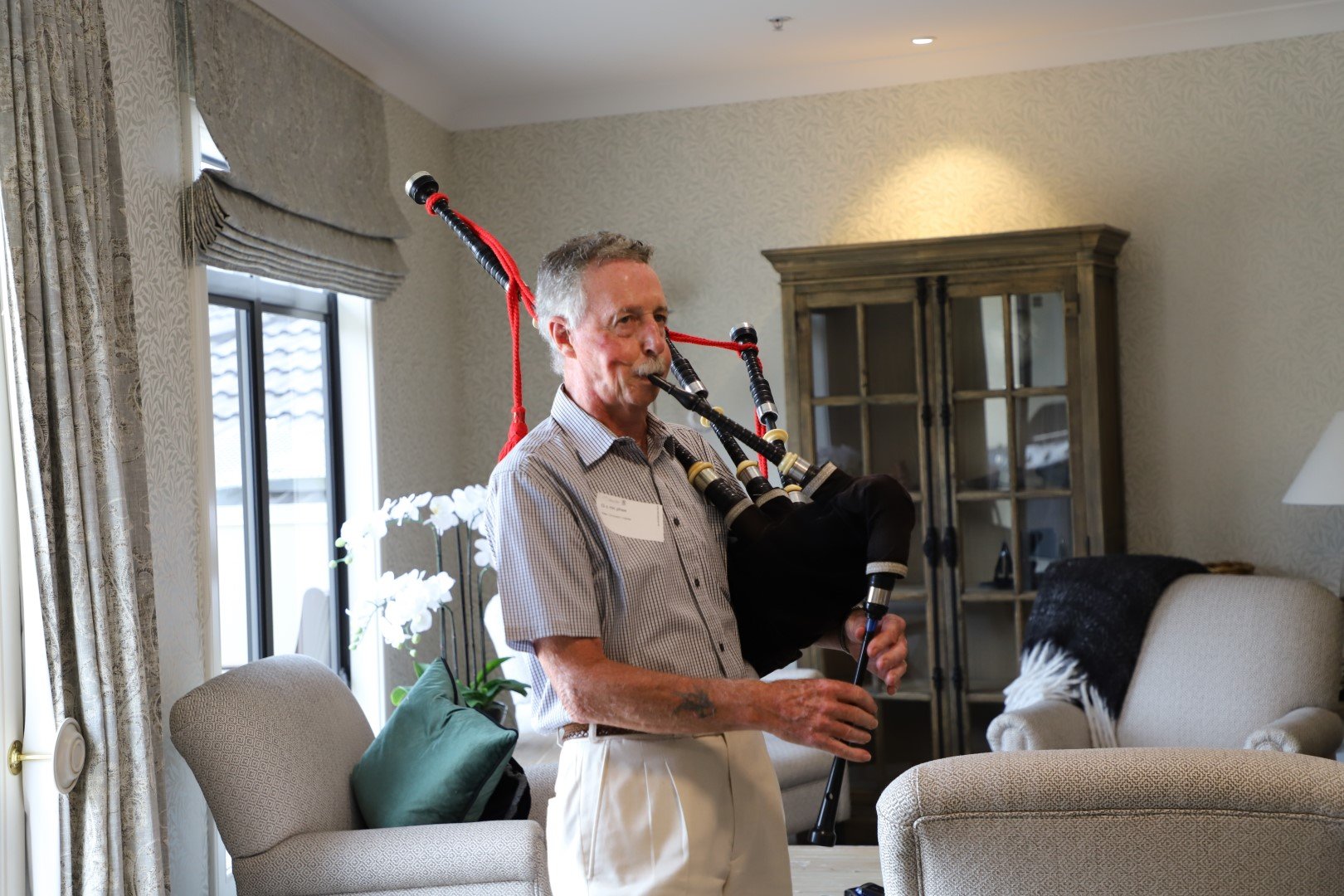 Glen and Glenda McPhee had another surprise for Jim, who was born in Kirkentilloch, Scotland, with Glen bringing out his bagpipes (above) to play Happy Birthday as a special treat.