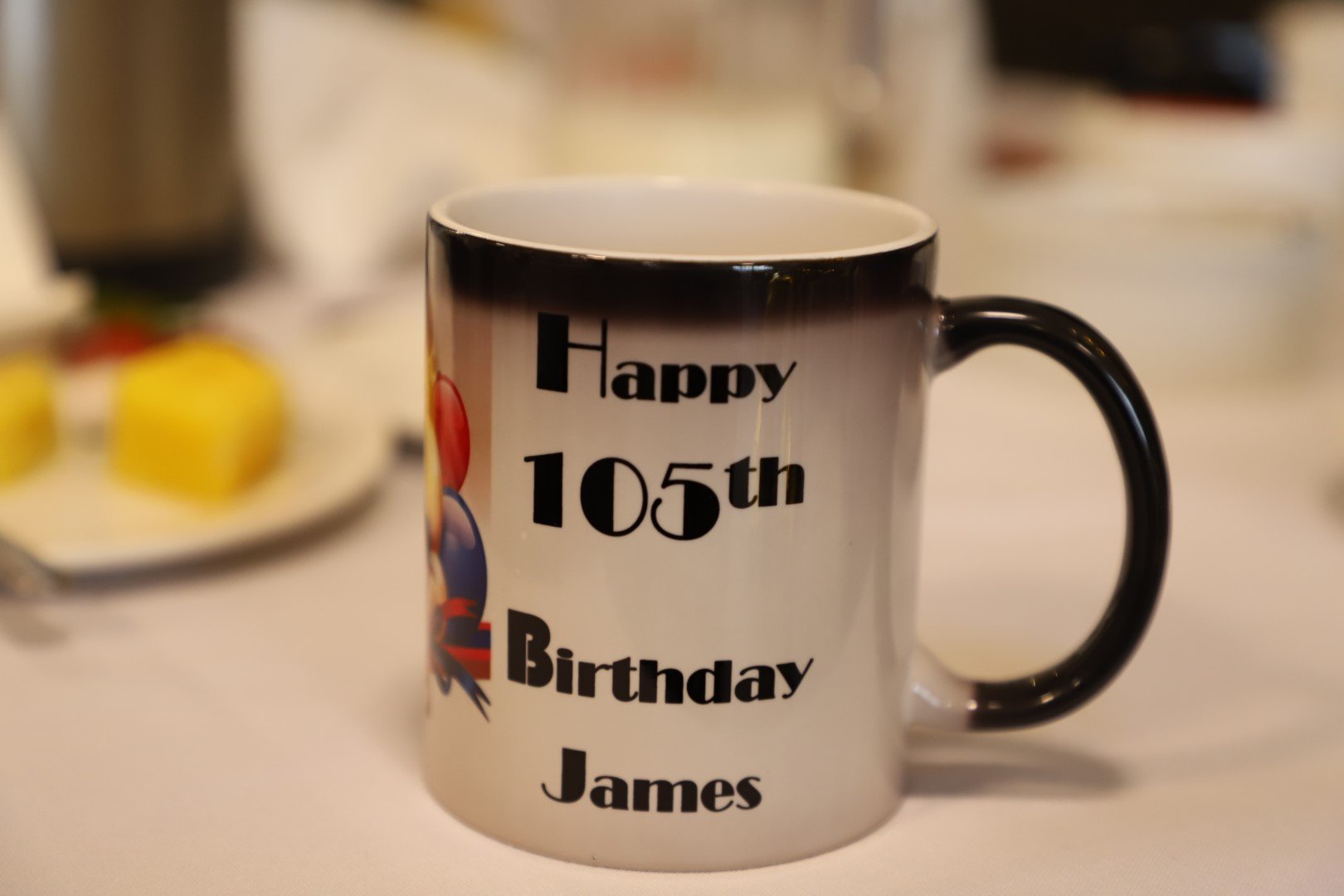 First up was from his favourite caregiver Regina Gounder, who gave him a new mug for his daily lunchtime soup. Not just any mug, this one reacts to the heat and simultaneously reveals an image of Jim’s face on one side plus the message Happy 105th Birthday on the other side!