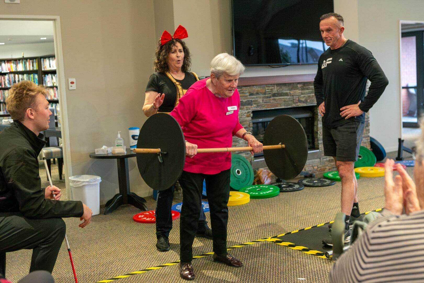 Residents, team members and contractors plus a few special guests cheer and applaud as Mona lifts the barbell above her head.