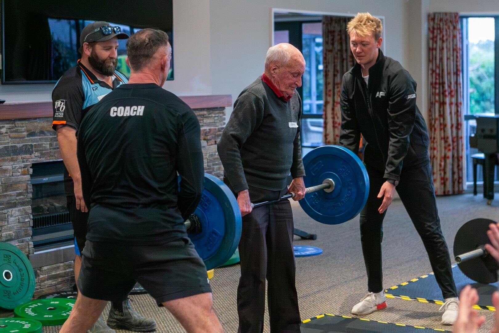 Colin Davidson, 92, did the heaviest lift at 60kg, surprising even himself, and even 100-year-old Bill Wells from the rest home unit came out and gave it a go.