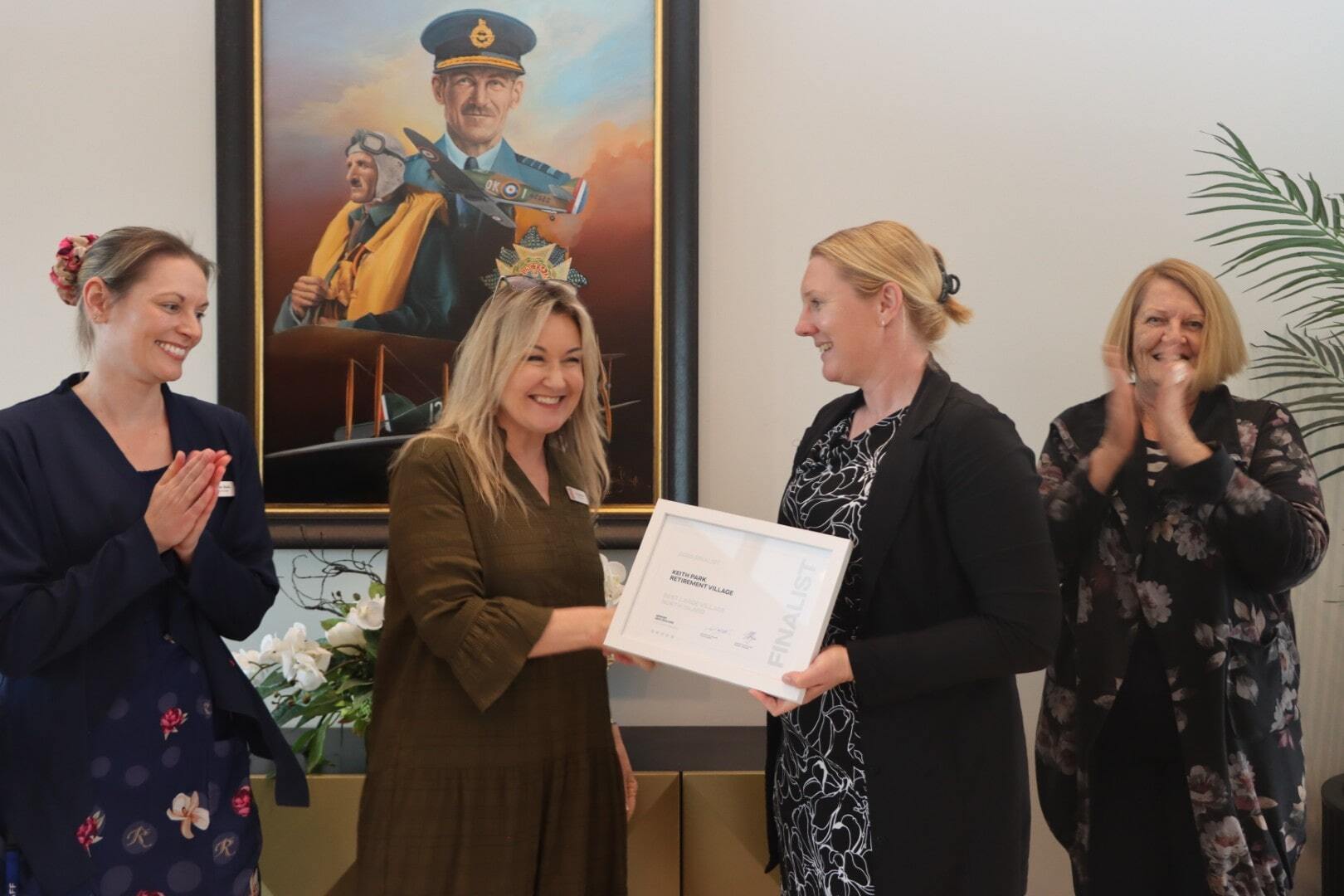 Above: Diana Isaac Village Manager Amy Amtman (second from right) with their incredible three awards - one for finalist in the Large South Island aged care category, one for finalist for retirement living in large South Island facility and one for Enduring Excellence after demonstrating consistent award excellence.