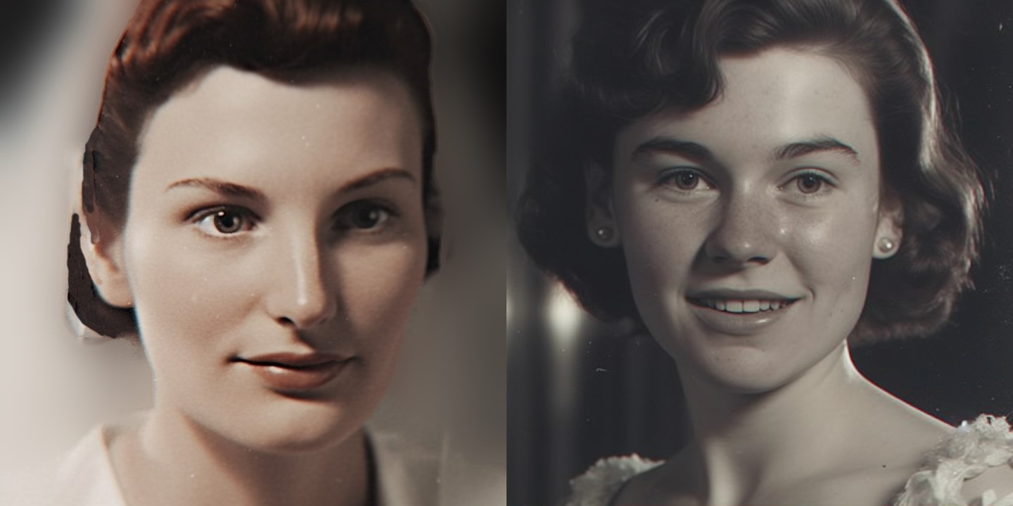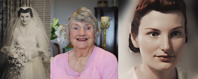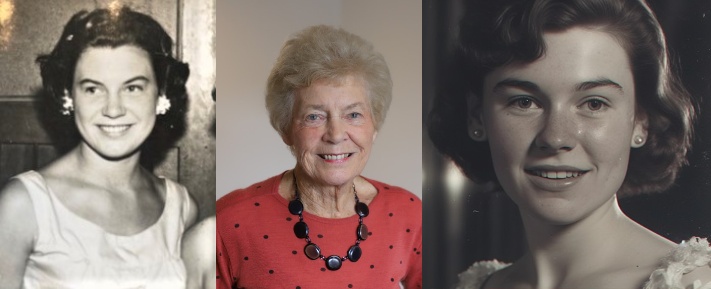 Left to right: Pamela as a young woman, Pamela today and the AI likeness of Pamela inspired by her old photograph.