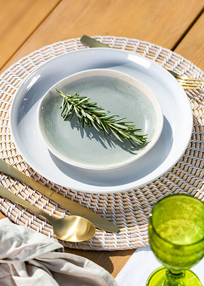 The key is to tie everything together for a cohesive style. You might choose to do this with colour, shape, texture, or maybe pattern. For example, a linen table runner pairs beautifully with linen napkins and rustic touches like rosemary sprigs.