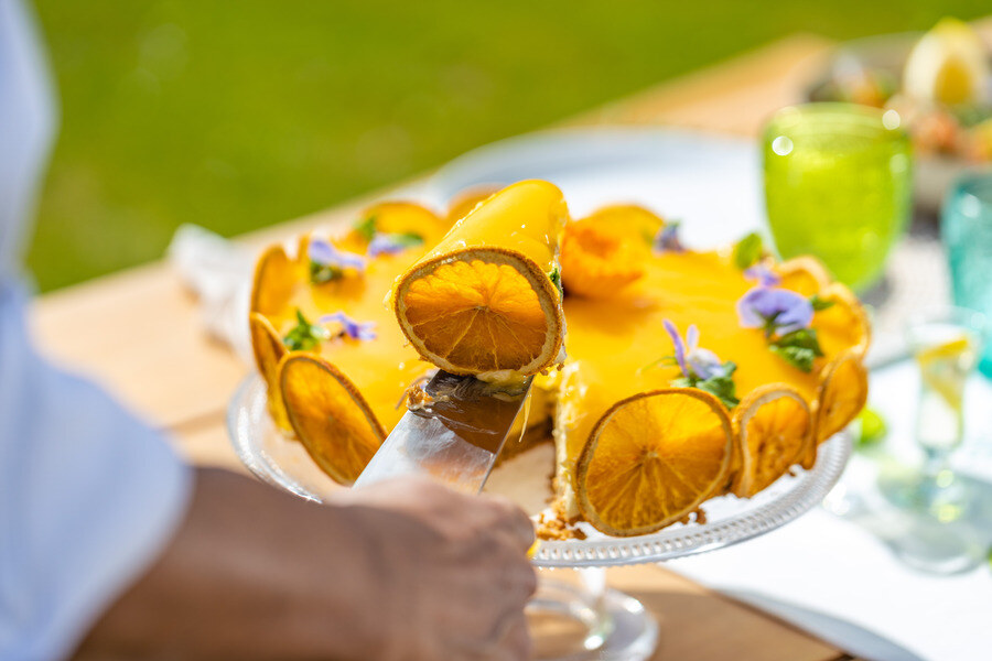 This cheesecake is the perfect dessert for any summer holiday occasion! It features a crunchy gingernut biscuit base and a smooth, creamy mascarpone filling that’s both tangy and sweet. Topped with a layer of lemon curd and finished with mint and edible flowers, it’s as beautiful as it is delicious, making it a guaranteed crowd-pleaser.
