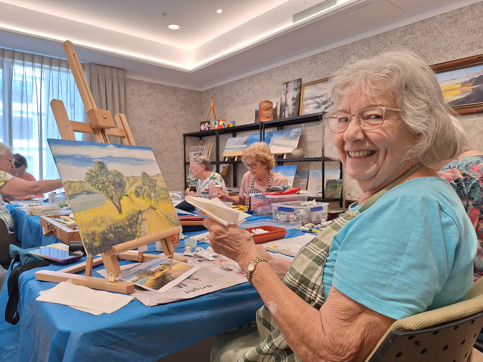 Getting creative is a great way to keep your mind active. At Miriam Corban Village, a resident-led painting group has formed thanks to Malcolm, who shares his passion for art by teaching fellow residents new painting techniques through group projects designed to build skills and confidence.