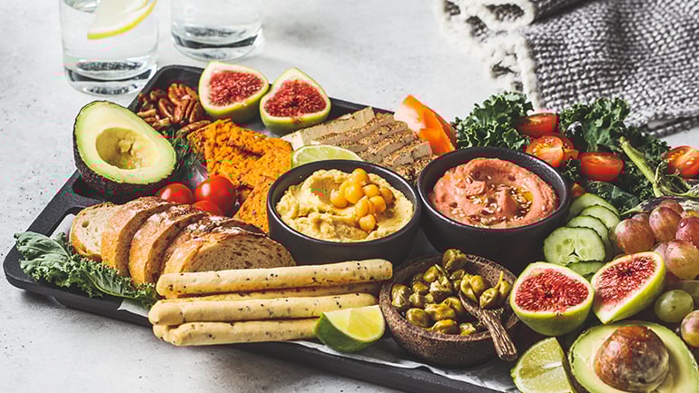Using a nice, big platter or board, start by placing out your cheese. Try to use different types, it’s good to choose one for slicing, one spreadable and one flavoured for good range. The same goes for crackers and breads - go for different textures, flavours and sizes. Spread around vegetables, fruits, olives and falafel for plenty of colour too! Place little bowls for oil, vinegar, dips and spreads around the board, and add the finishing touch with some fresh herbs.