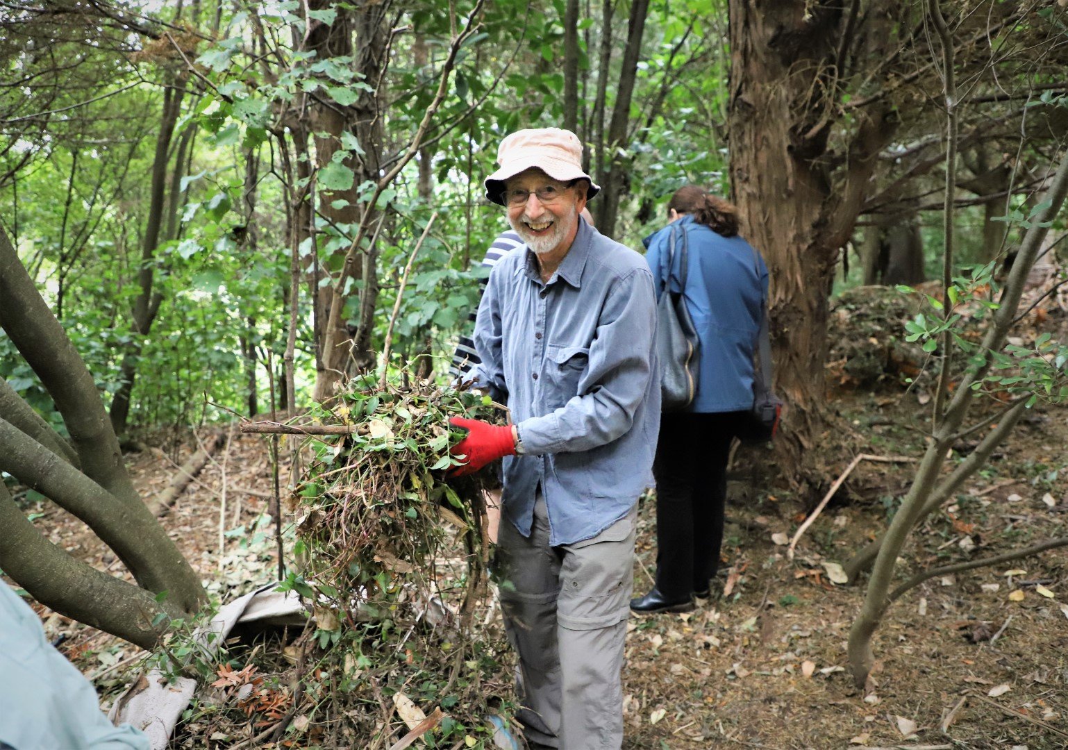 William Sanders resident Colin Griffiths scoops up armloads of weeds from the Glade, including the invasive tradescantia.