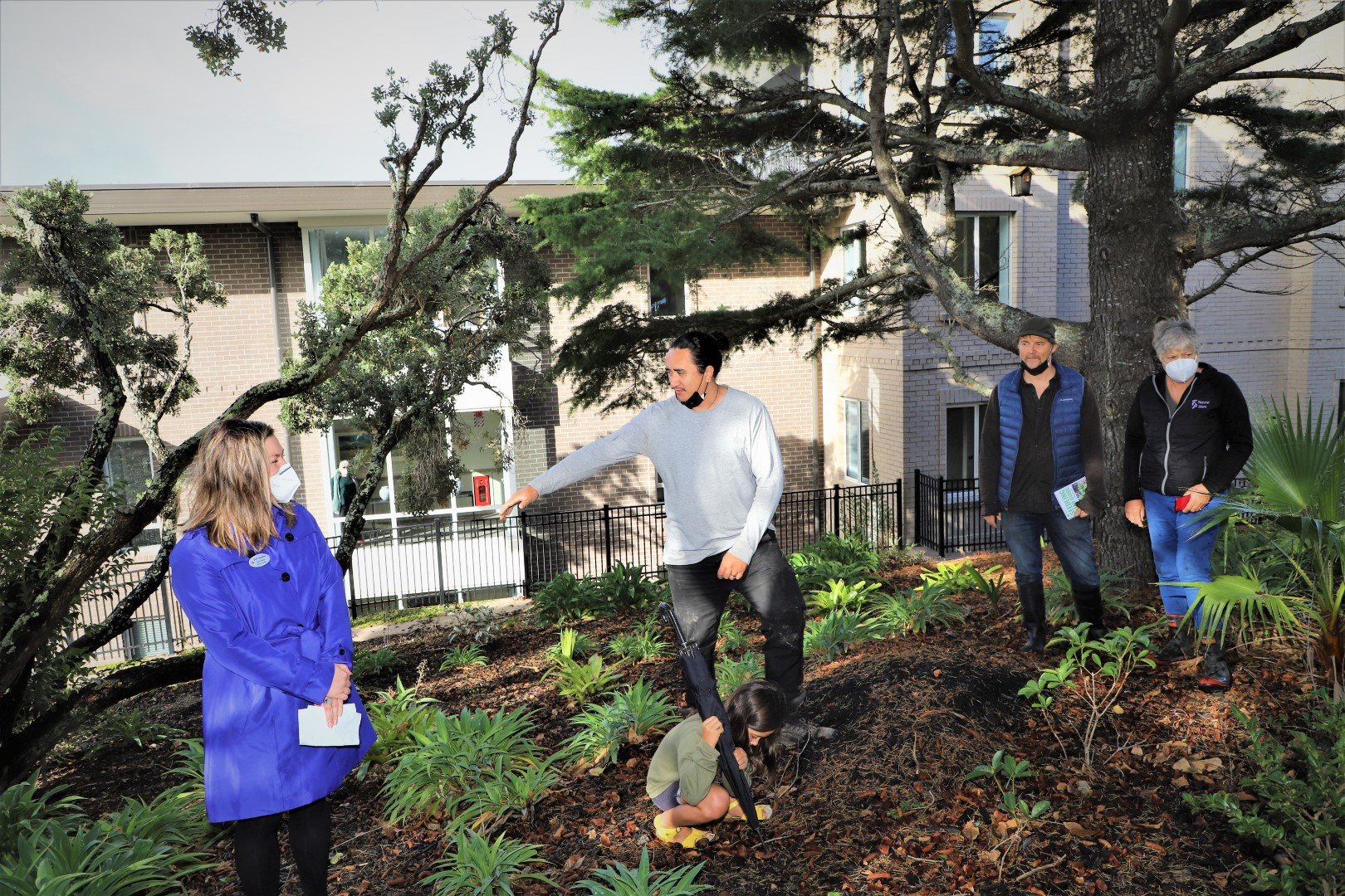 RTH volunteer Zane Catterall performs a karakia, with his daughter Olive listening on (above) and (below) RTH Coordinator Lance Cablk helps plant a houhere while Head Gardener Aaron Brown throws on some fertiliser.