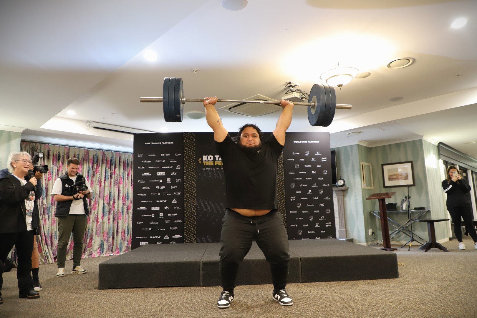 The popular athlete, who will compete in the men’s 102+kg division, was revealed as the latest member of the NZ team who will be attending the Paris Olympics to gathered media and a packed village centre, where he thrilled the crowd with his impressive lifting skills.