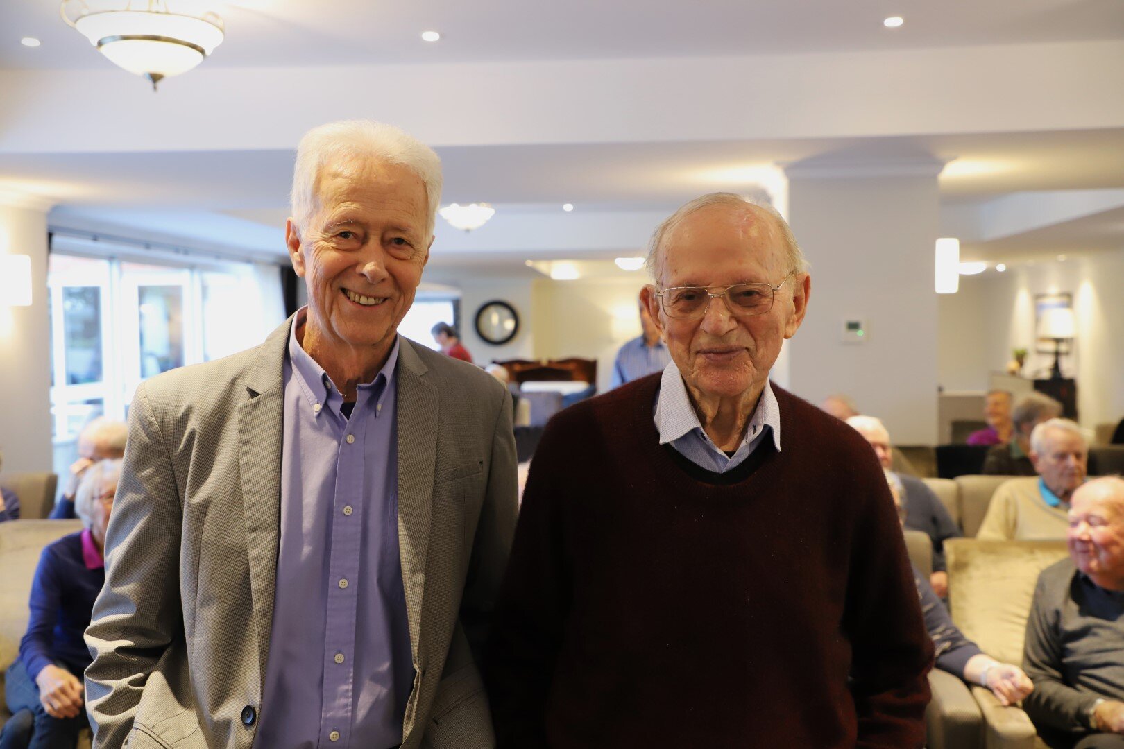 Leigh with New Zealand's oldest athletics coach, Arch Jelley, who shared his life story with William Sanders residents in 2023.