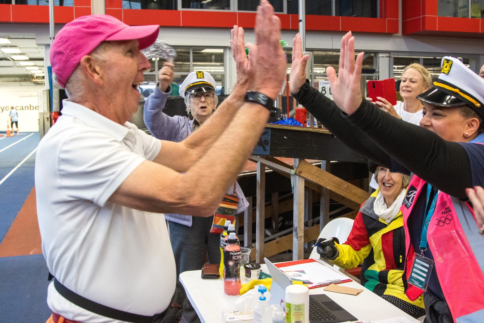Last walker of the day Clive Sinclair high fives Village Champion Jo Legall-Misikini after finishing first