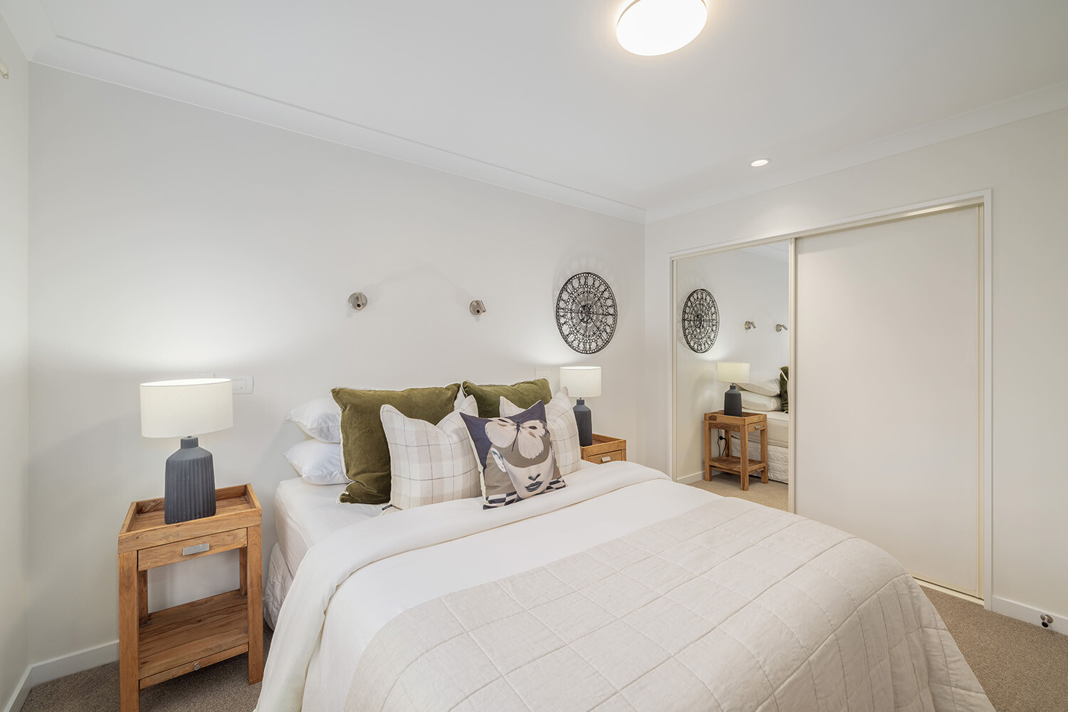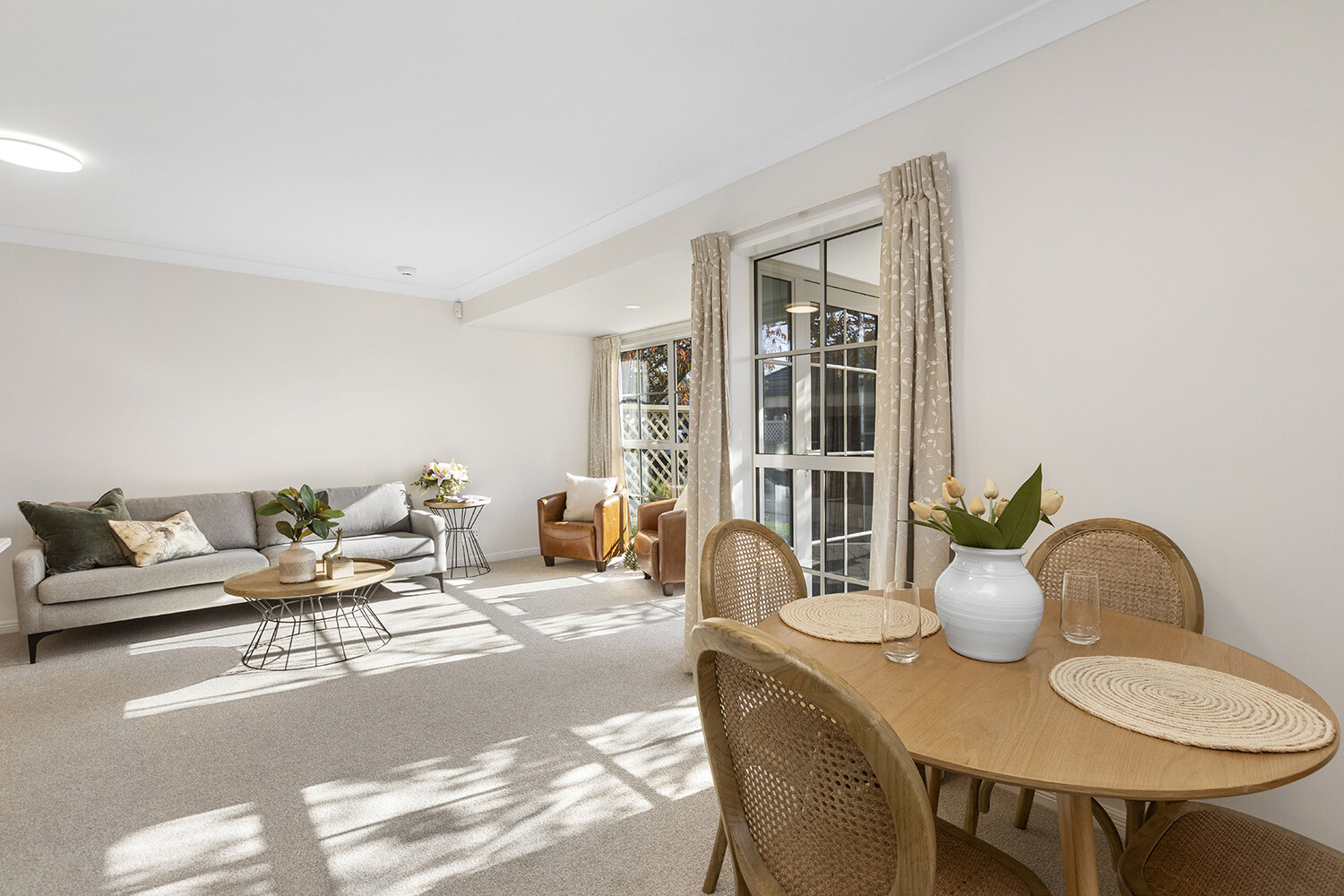 An exterior driveway offers the best of both worlds – enjoying a sense of privacy while staying connected to village life and benefiting from the village’s services and security. Perfect for hosting friends and family this open plan kitchen and dining area makes cooking meals and entertaining a breeze. French doors from your master bedroom and living area open up to individual patios where you can admire the gardens.