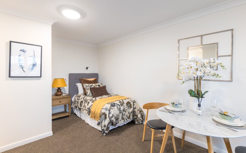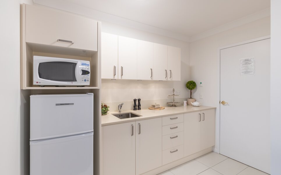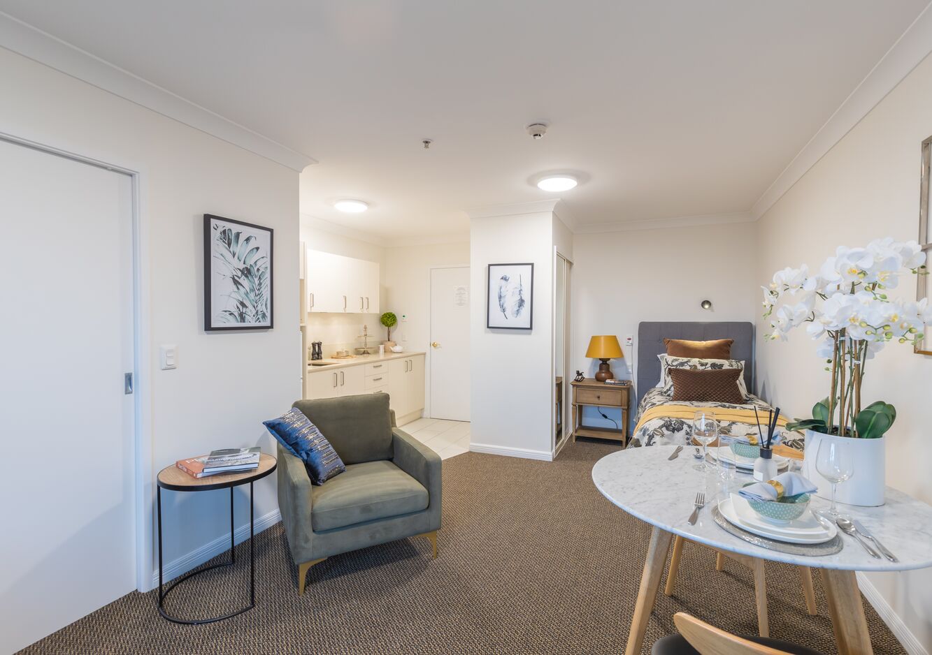 Our serviced apartments have an open plan layout and are equipped with your own kitchenette and microwave, so you can prepare light meals. Choose from studio or studio with alcove options, complete with bathroom and level access shower.